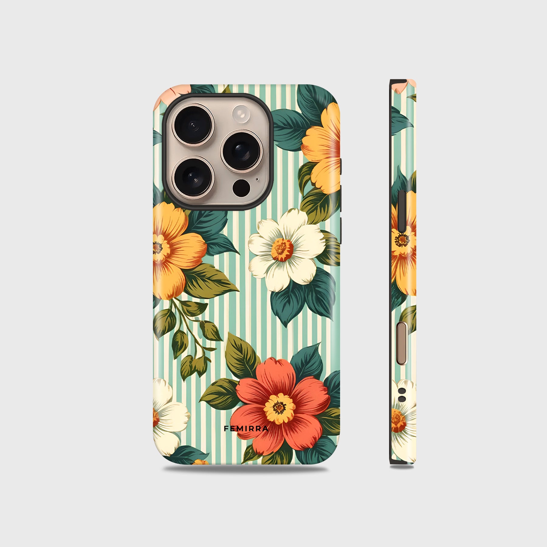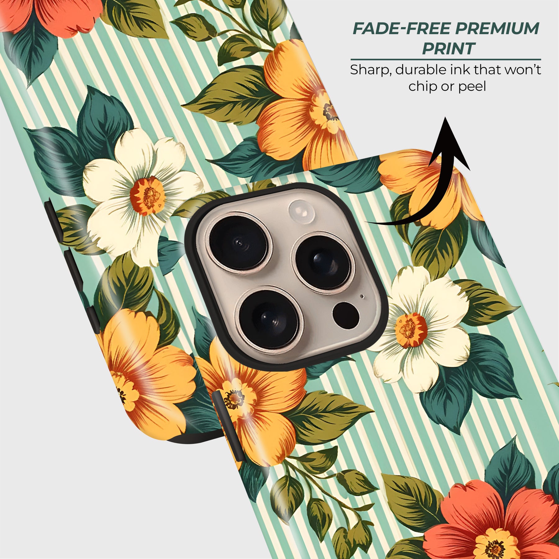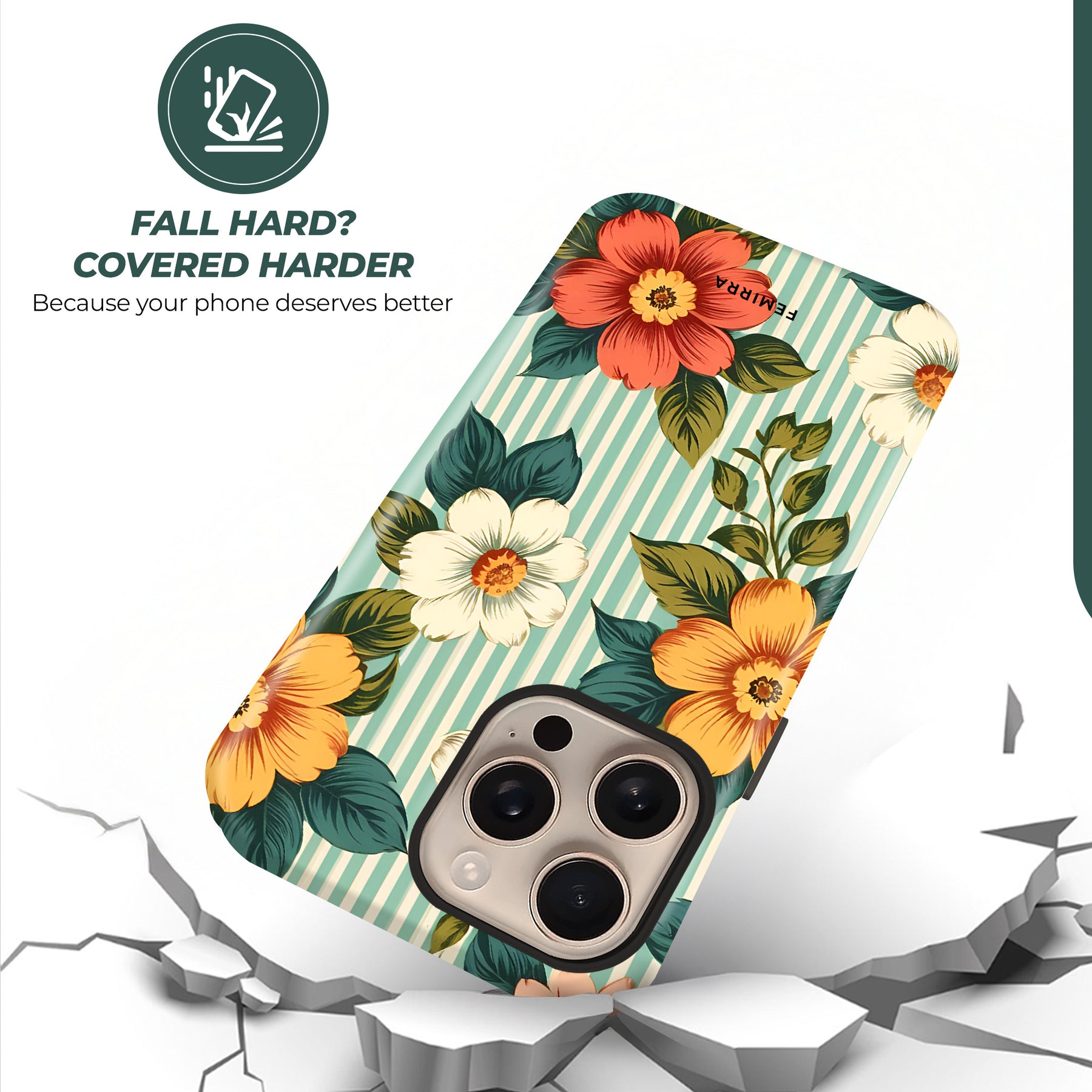 Bring a touch of classic beauty to your phone with the Velvrosa Case. Featuring bold, hand-painted floral patterns in shades of red, white, and golden yellow against soft vertical stripes, this design perfectly blends vintage elegance with modern charm.