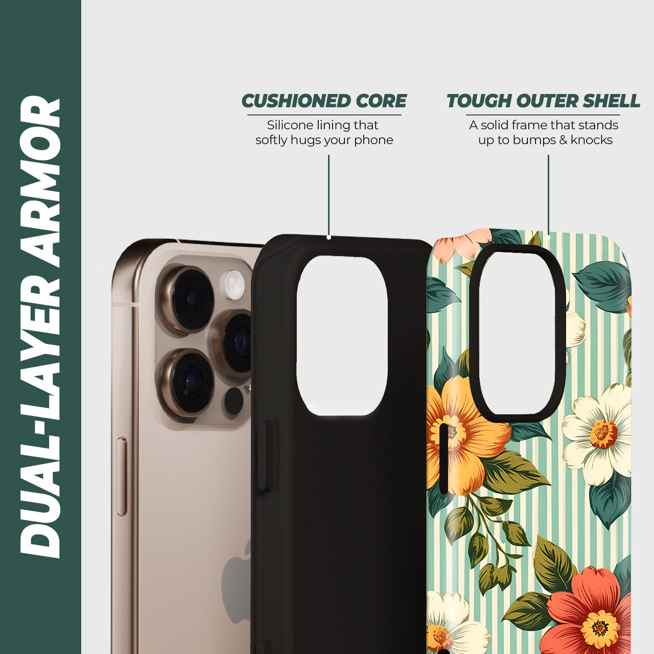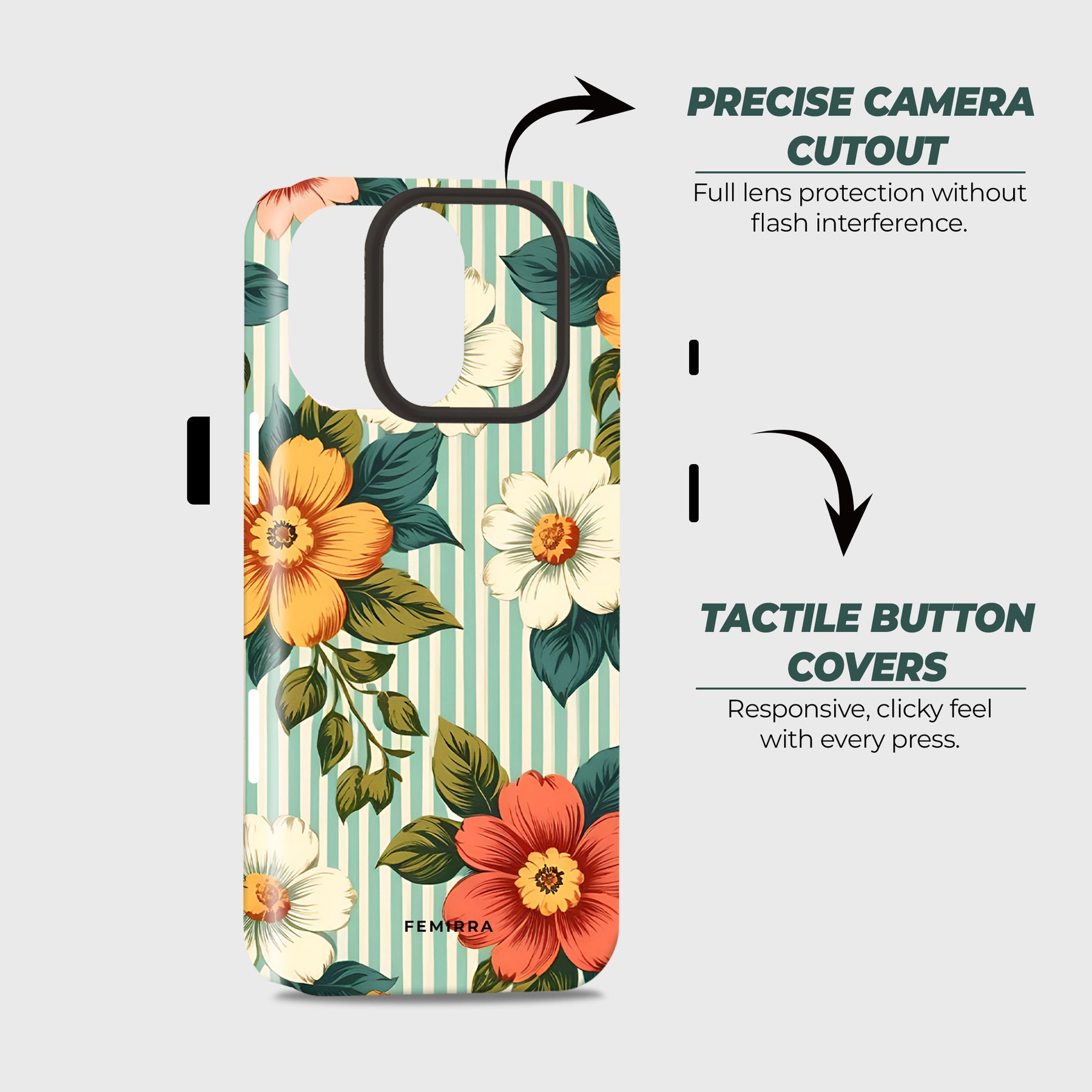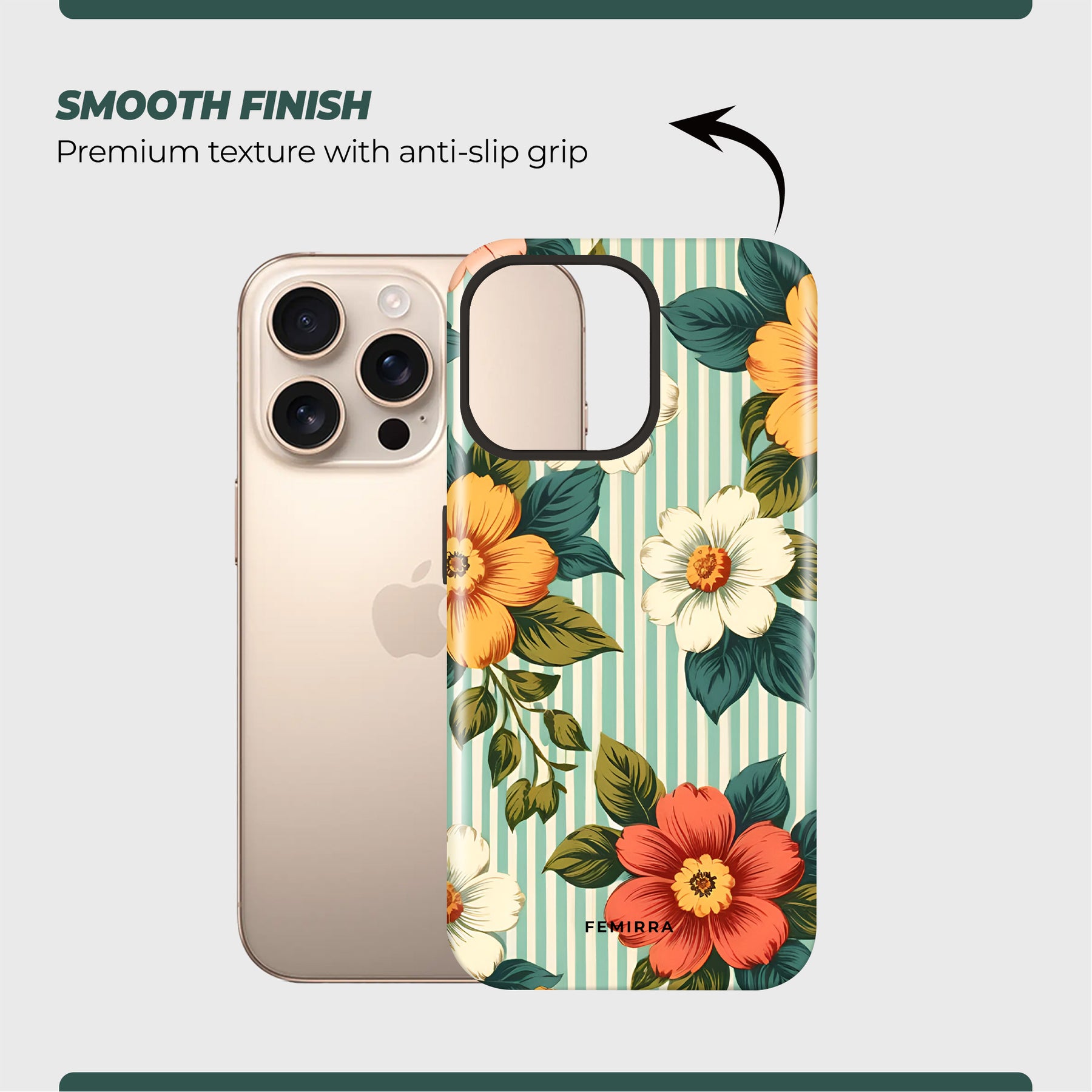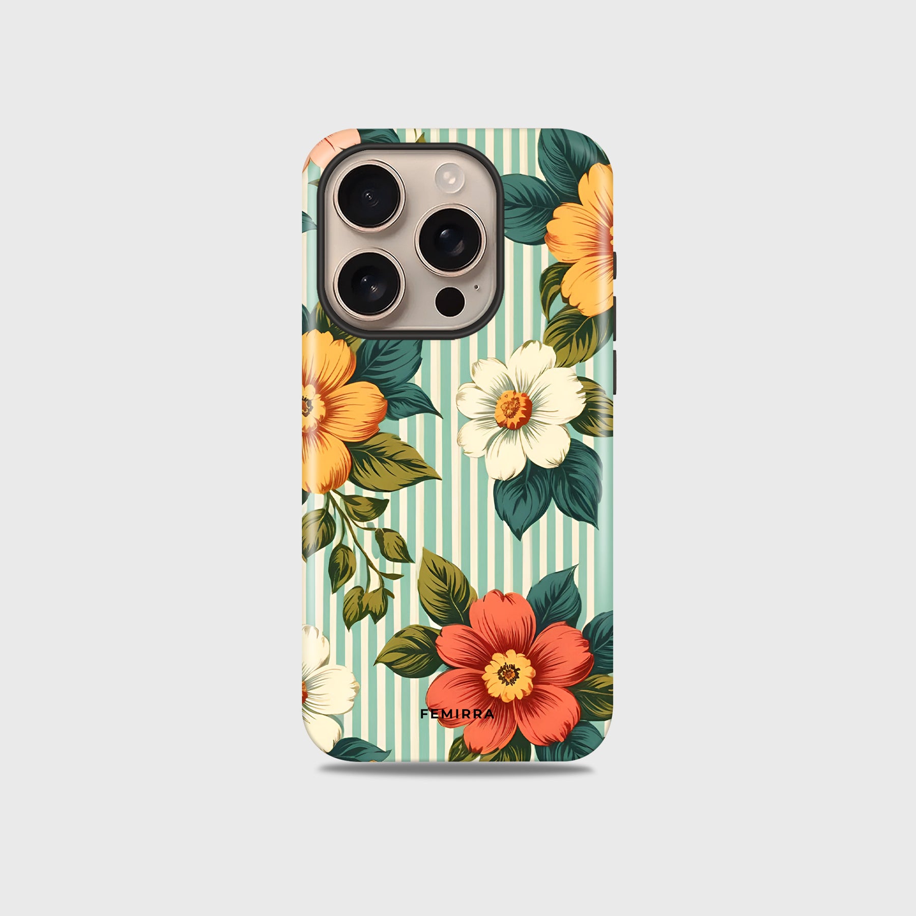 Bring a touch of classic beauty to your phone with the Velvrosa Case. Featuring bold, hand-painted floral patterns in shades of red, white, and golden yellow against soft vertical stripes, this design perfectly blends vintage elegance with modern charm.