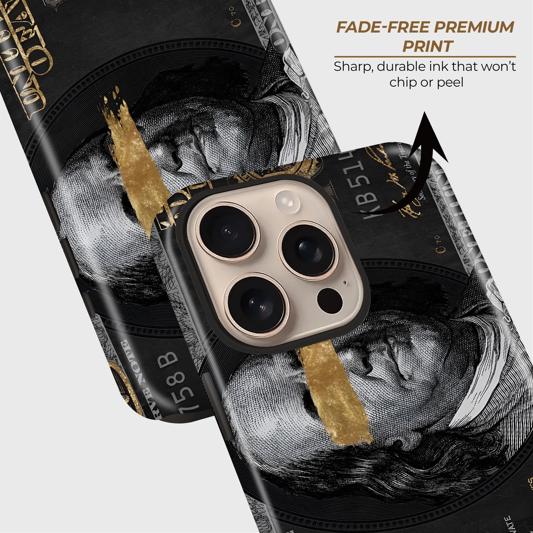 A bold twist on the iconic $100 bill, this CashFlows case features Benjamin Franklin’s portrait in sleek monochrome with a striking gold brushstroke across the eyes. The design symbolizes mystery, power, and the hidden nature of wealth, while exuding luxury through its black-and-gold palette