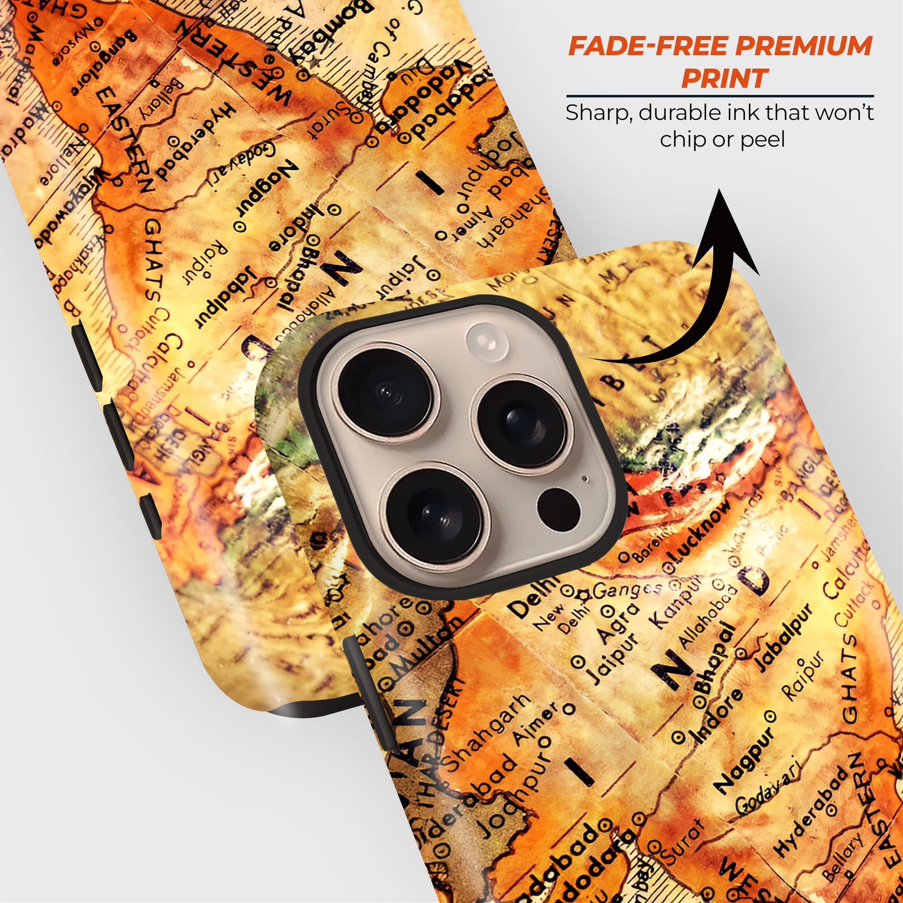 This phone case features a vintage map design focusing on the Indian subcontinent, with detailed city names and geographic markings. Its warm, sepia-toned aesthetic evokes a nostalgic and adventurous feel, perfect for travelers and history enthusiasts. The high-quality print adds a touch of sophistication, while the durable material offers reliable protection for your device.