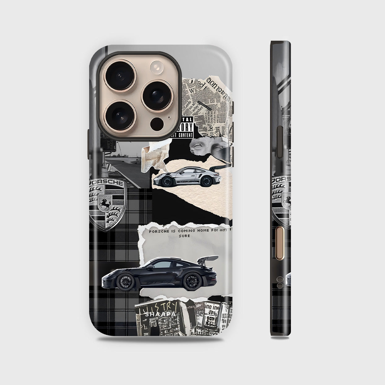 A creative collage-style case featuring iconic Porsche elements, newspaper textures, and bold car visuals. Designed for those who appreciate luxury cars, heritage, and unique artistic flair
