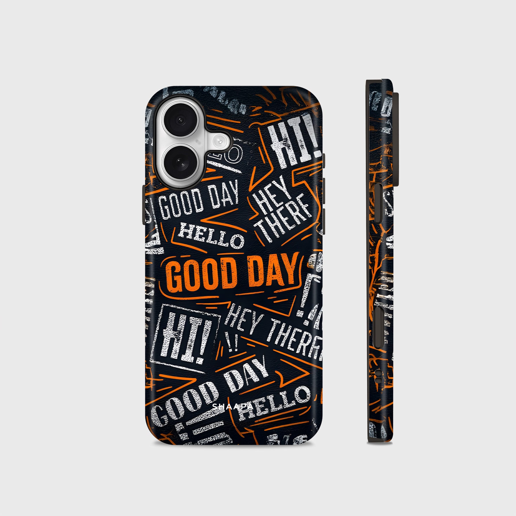 Brighten up your day with this Good Day featuring lively text art with phrases like “Good Day,” “Hello,” “Hi!” and “Hey There.” The bold orange and white typography on a textured dark background gives it a trendy, street-style vibe, perfect for spreading positivity wherever you go. Made with durable materials for long-lasting protection, this case combines style and functionality effortlessly.