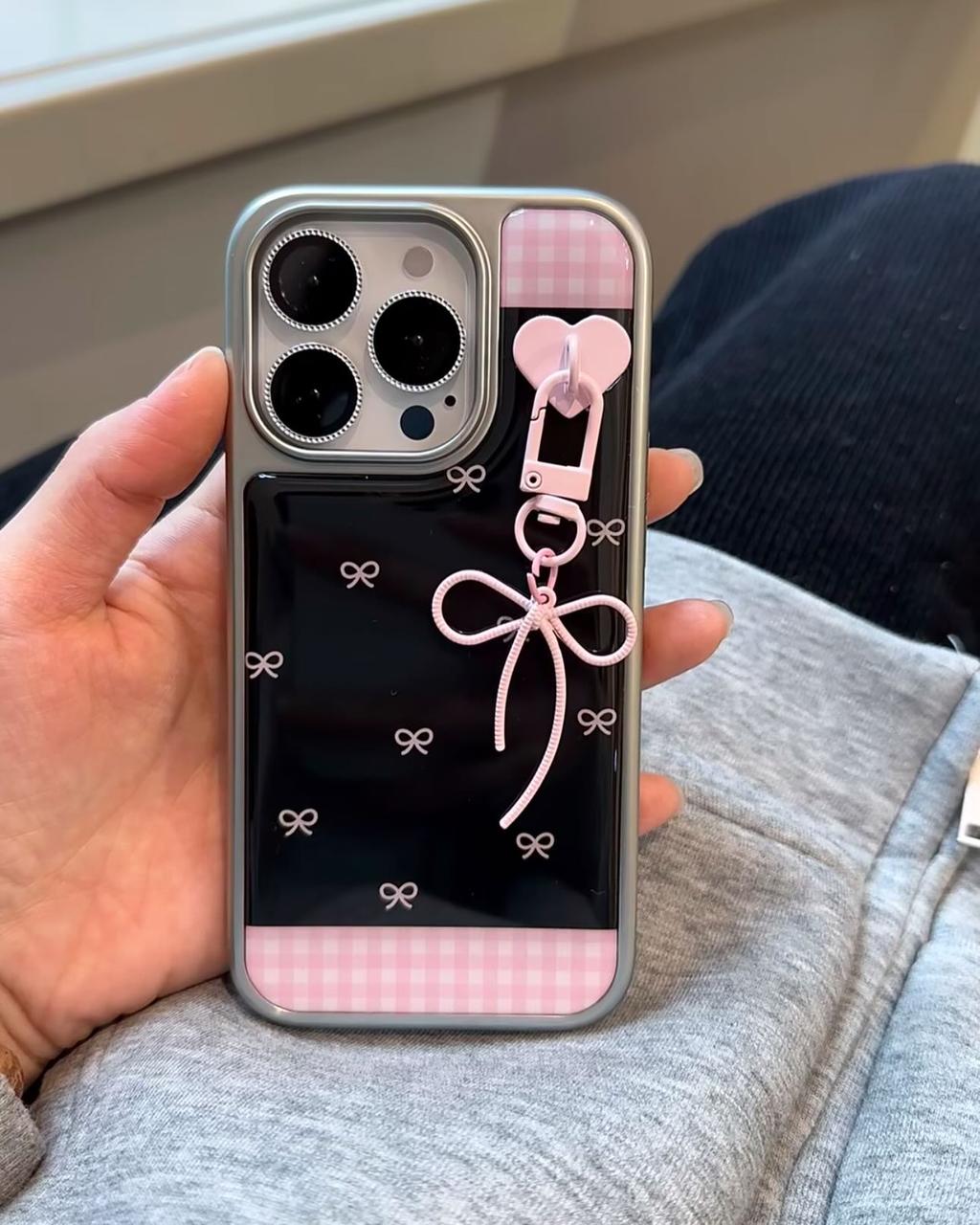 Elevate your iPhone’s everyday look with the Mini Sweet Bow, where cute meets confidence in a sleek, fashion-forward form. Designed for trendsetters who embrace both charm and function, this case features a glossy black bow-printed base with soft pink gingham accents—and a heart charm strap that adds both style and security.