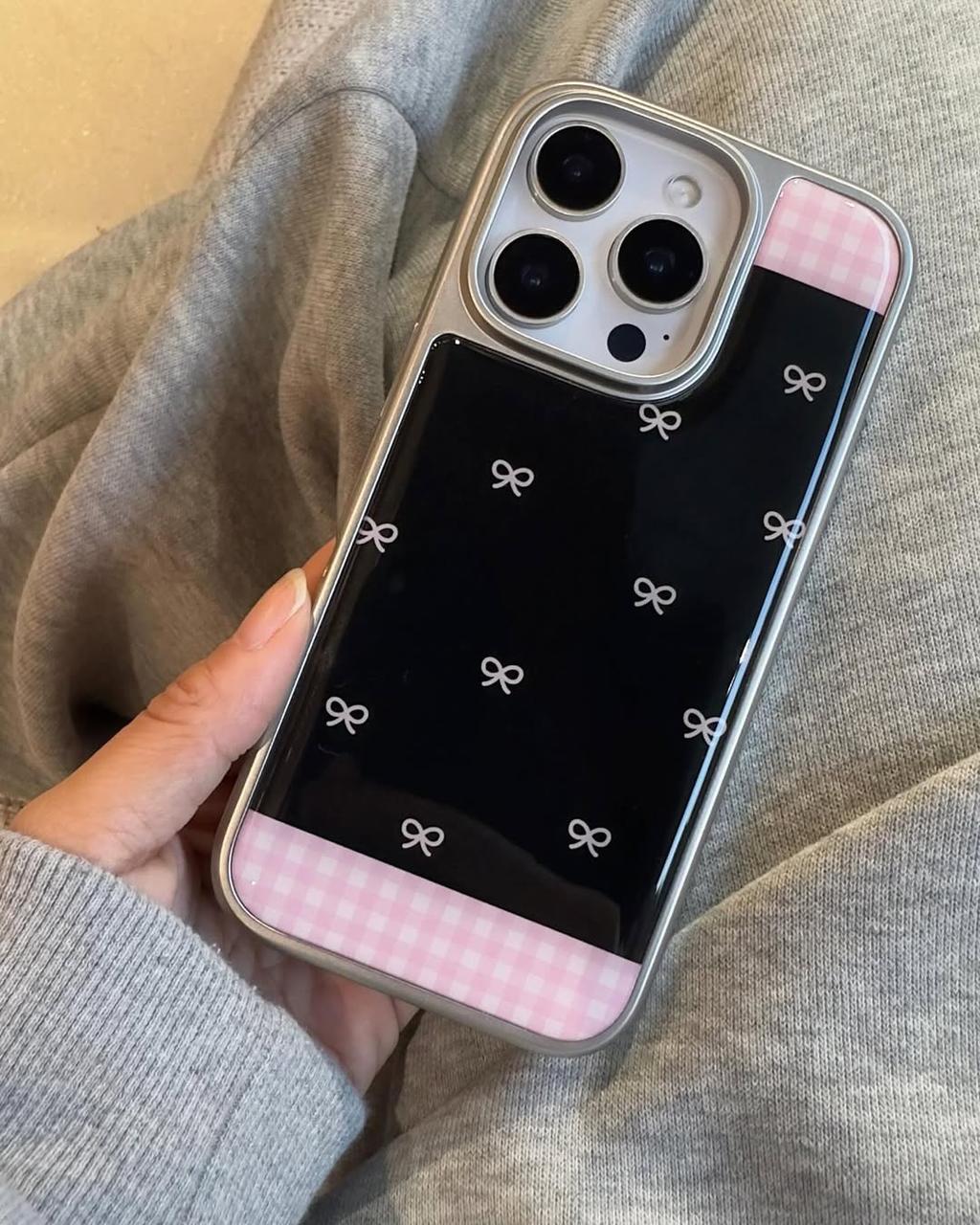 High-shine black background scattered with delicate mini bows for the perfect girly-meets-modern vibe. - 🎀 Gingham Accent Panels