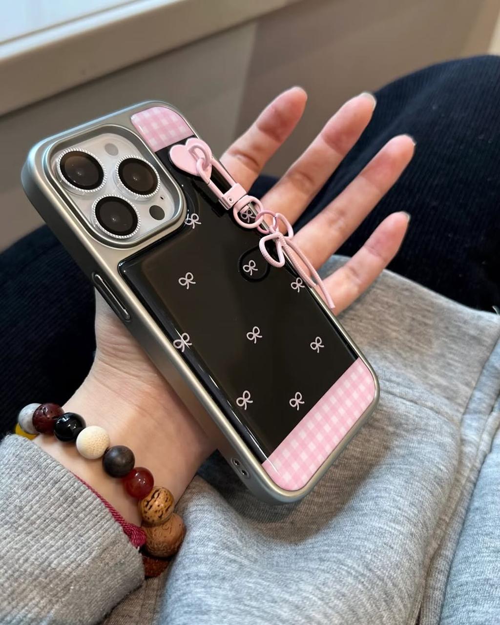 Keep your phone in hand or on display with a detachable pink charm that doubles as a wrist strap. - 🖤 Glossy Bow Pattern Finish