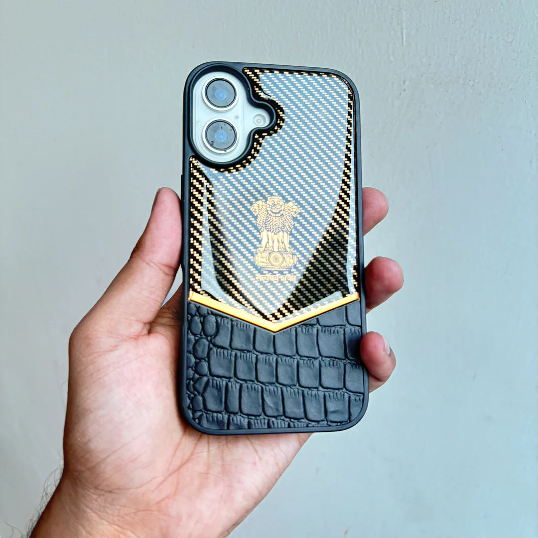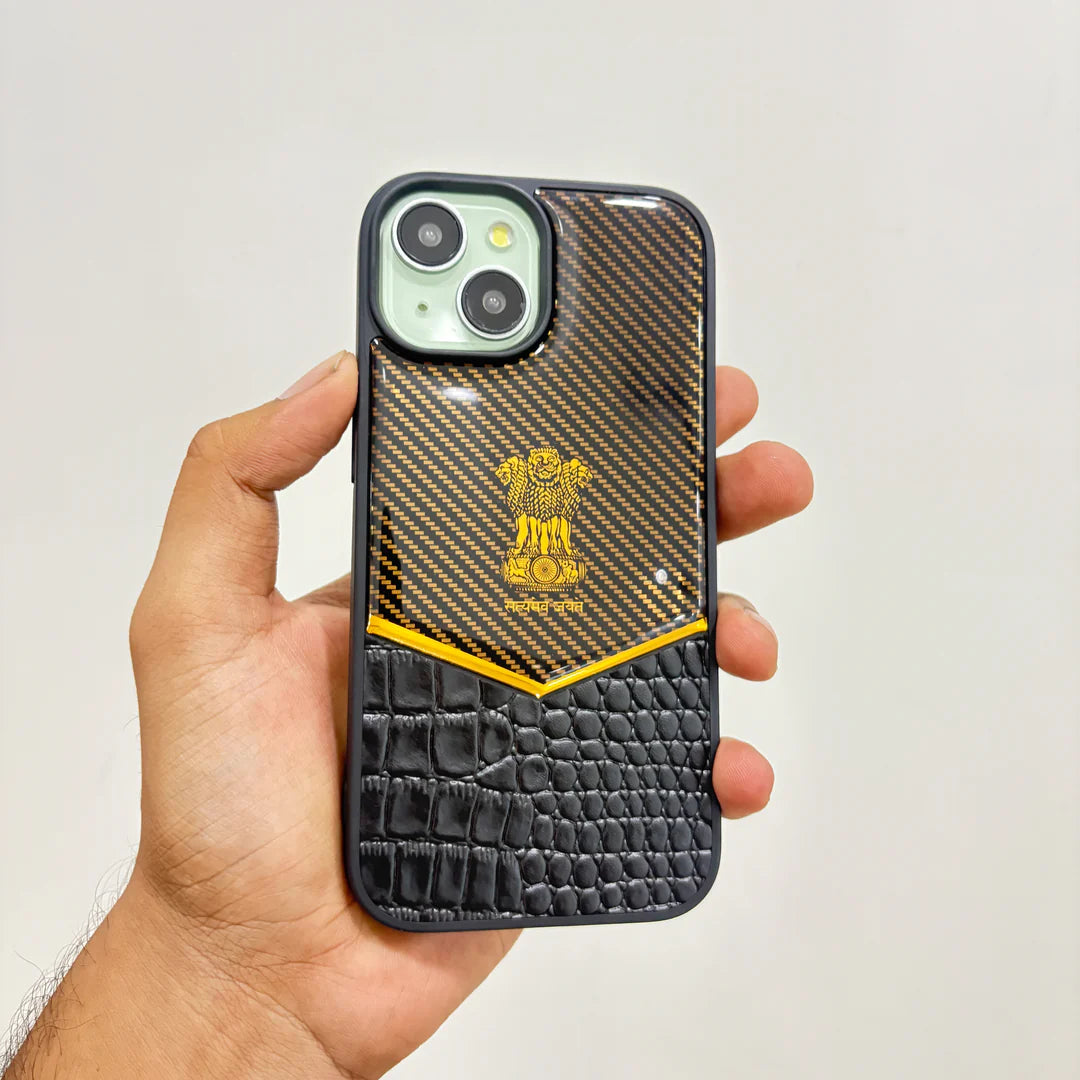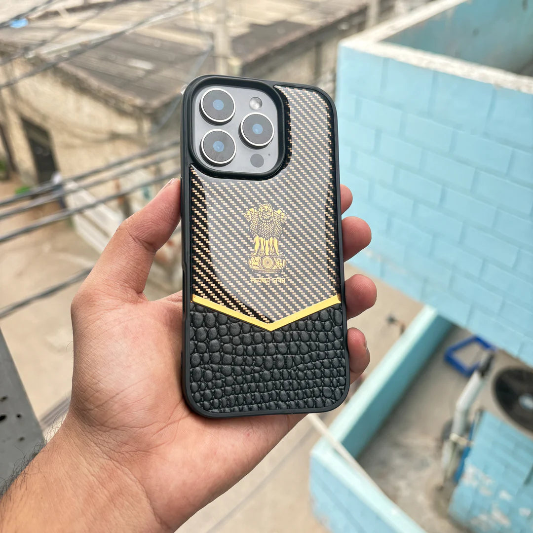 The Satyamev Jayate Elite Textured Case is designed for those who want to carry their patriotism with elegance. With a bold fusion of carbon fiber texture and premium leather finish, this case is more than just protection — it’s a symbol of strength, heritage, and modern luxury. At its center shines the Golden Ashoka Pillar Emblem with "सत्यमेव जयते", representing truth, honor, and the power of India.