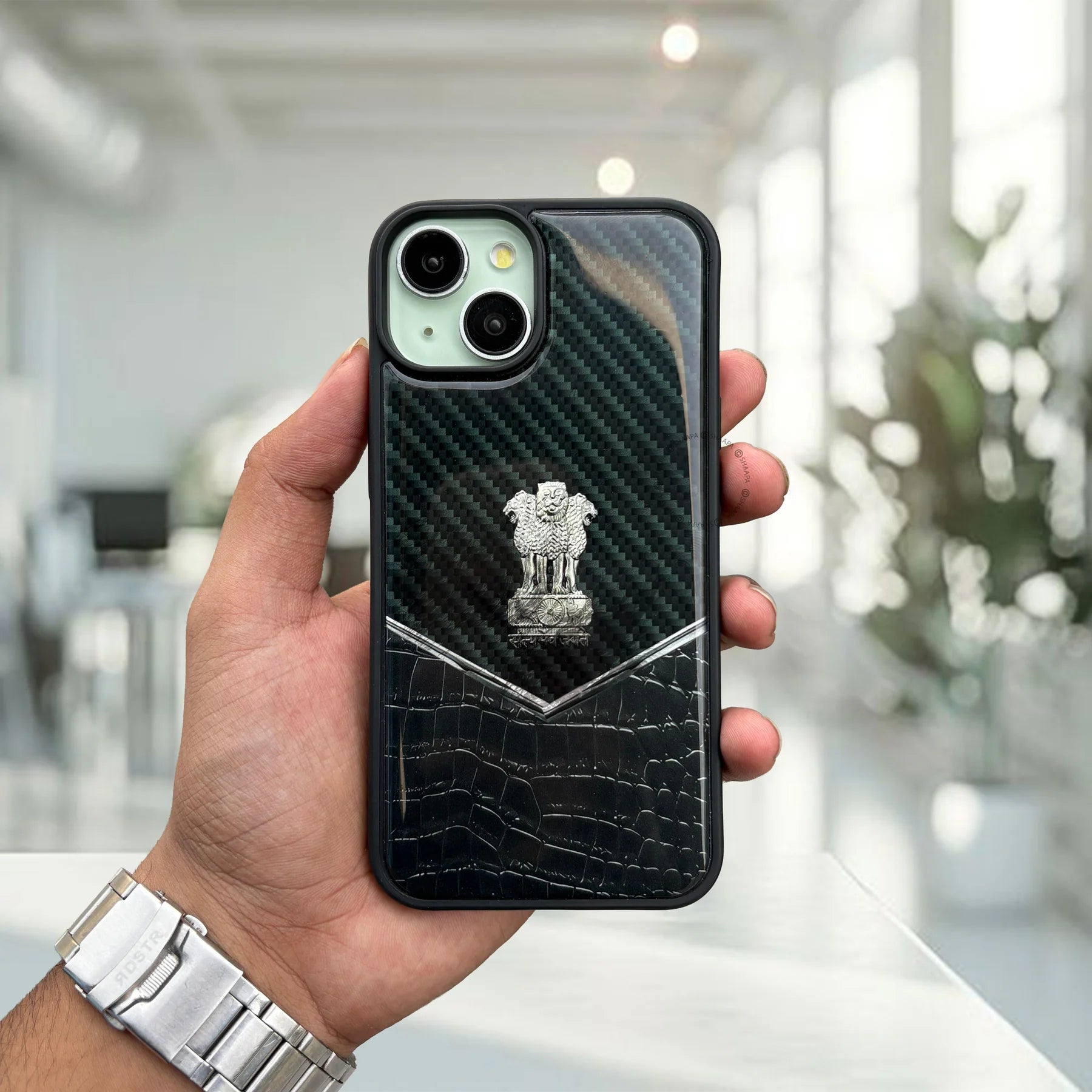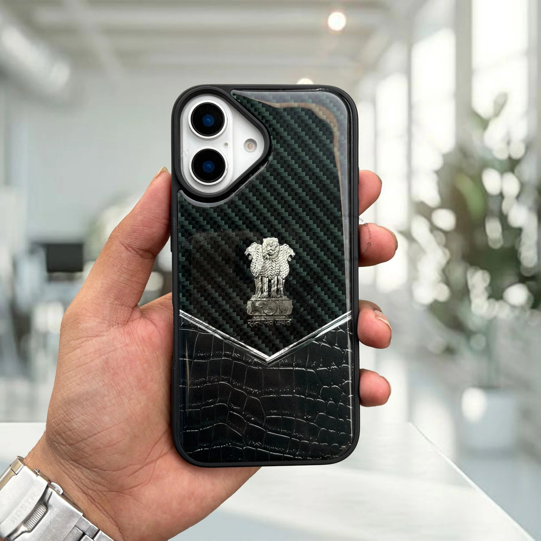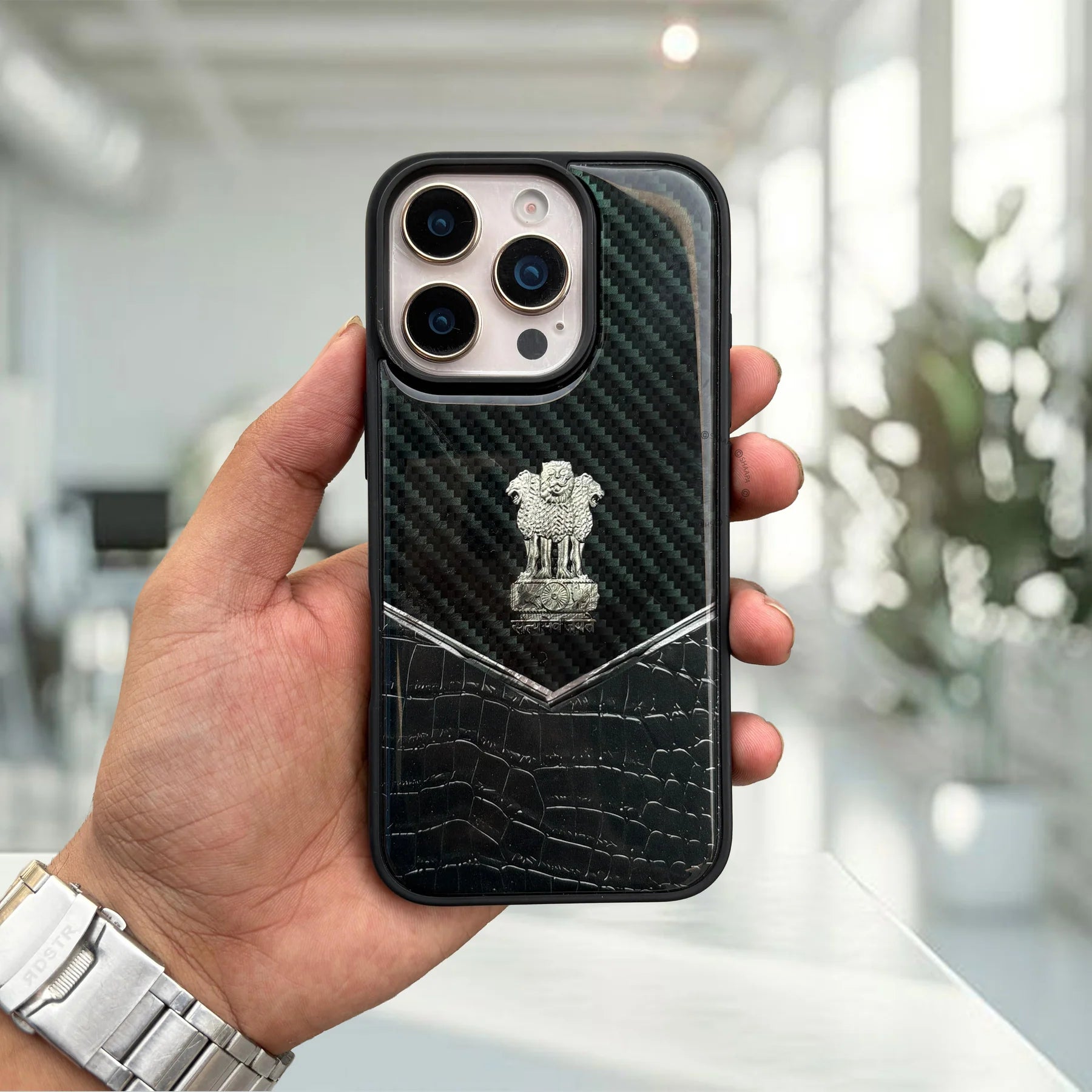 The Satyamev Jayate Elite Textured Case is designed for those who want to carry their patriotism with elegance. With a bold fusion of carbon fiber texture and premium leather finish, this case is more than just protection — it’s a symbol of strength, heritage, and modern luxury. At its center shines the Golden Ashoka Pillar Emblem with "सत्यमेव जयते", representing truth, honor, and the power of India.