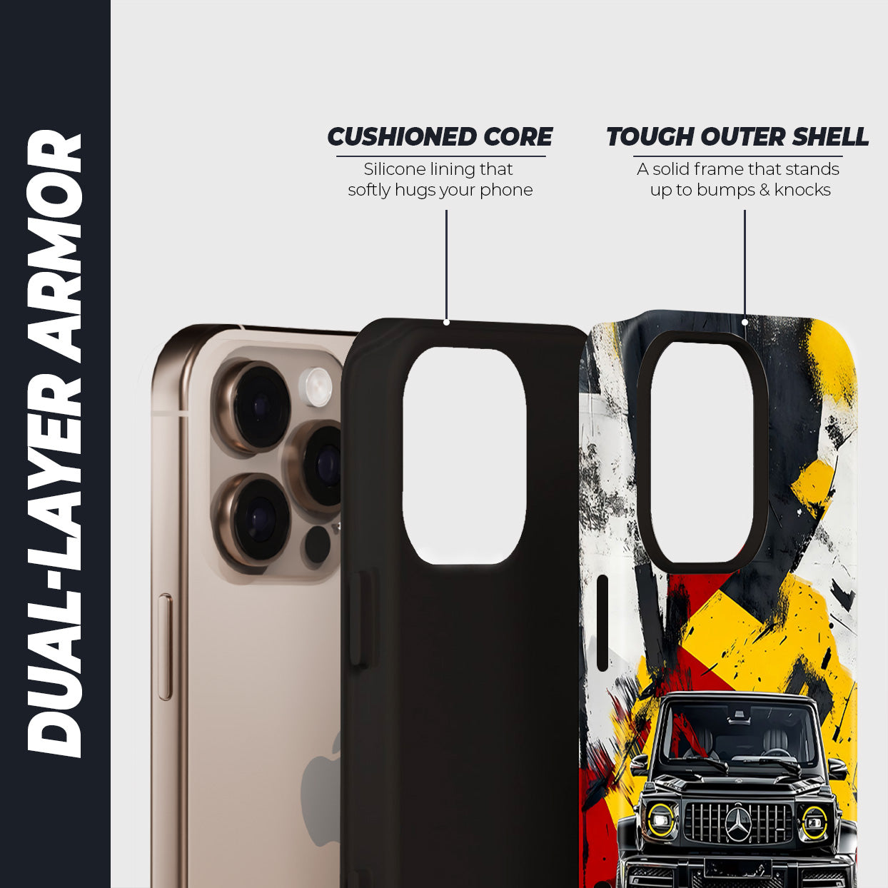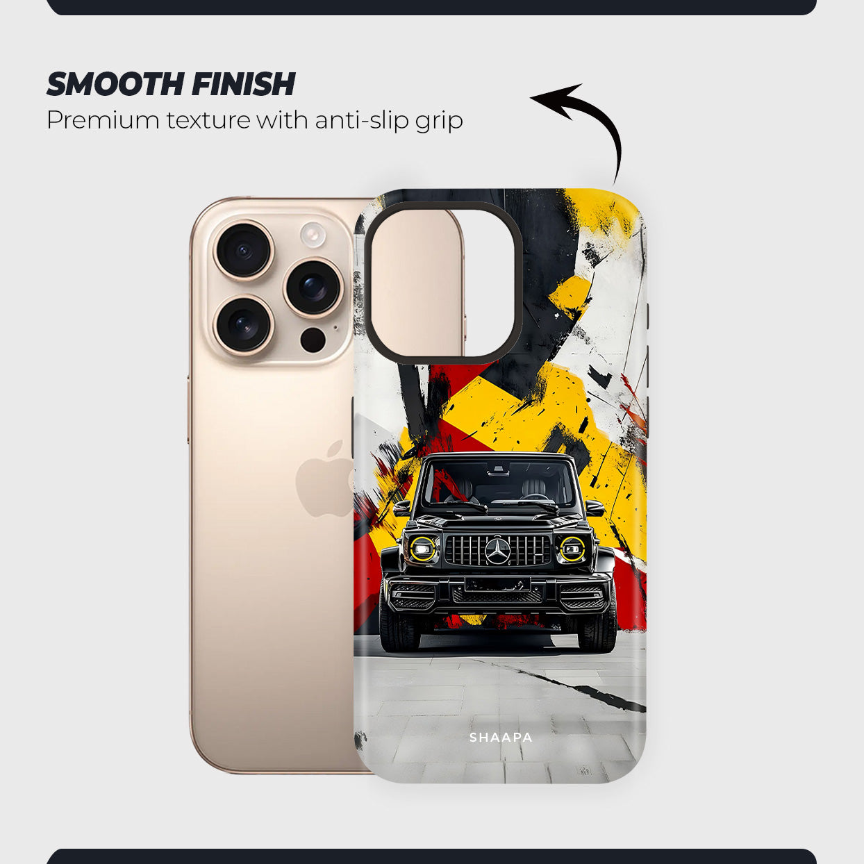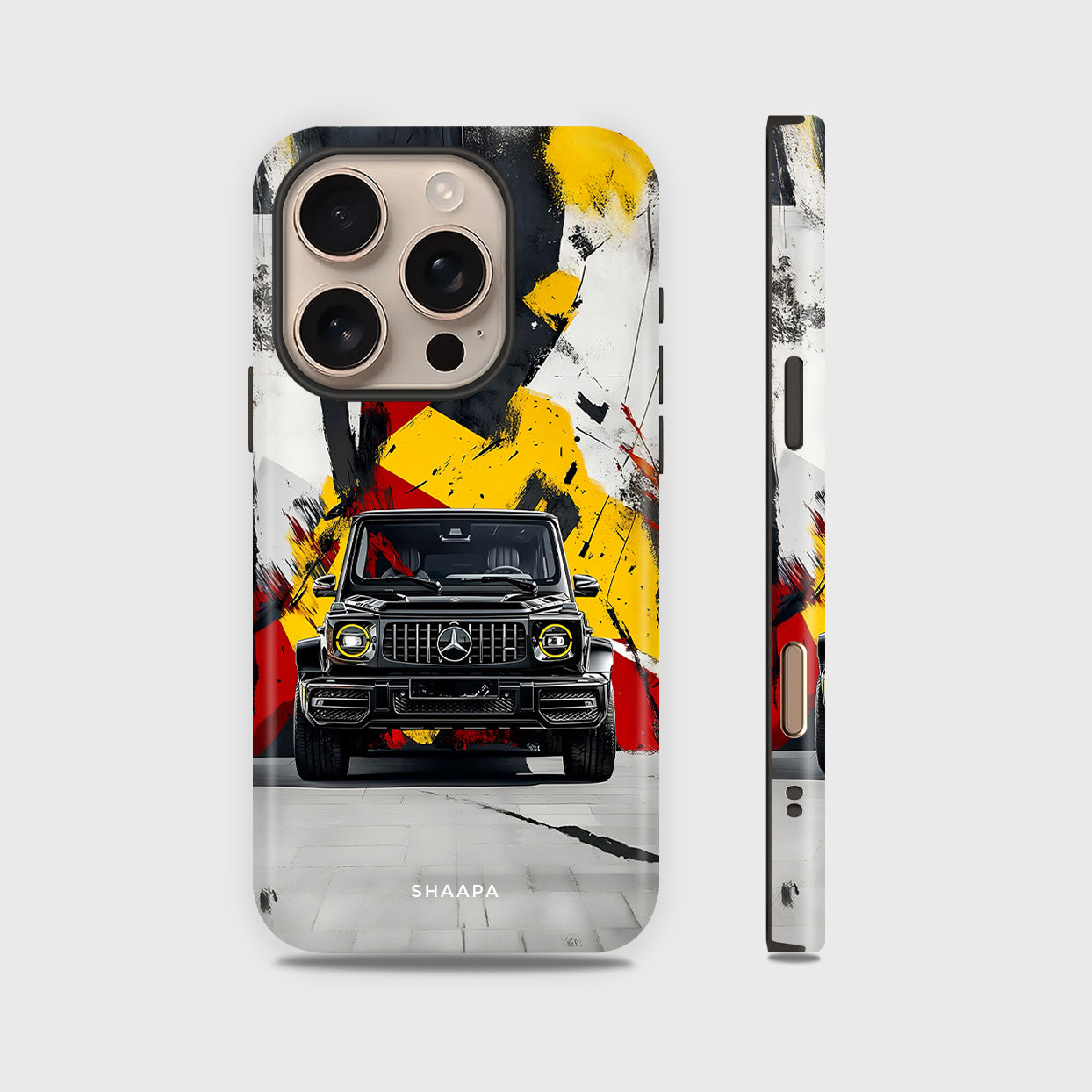 Bring unmatched luxury and boldness to your phone with this Wagon Case. Featuring a front-view of the iconic SUV set against a striking abstract backdrop of red, yellow, black, and white, this case symbolizes dominance, strength, and premium style. The artwork blends urban street art with automotive elegance, making it the perfect accessory for car enthusiasts who live life in the fast lane. A true statement of power, class, and fearless attitude—right in your hand.