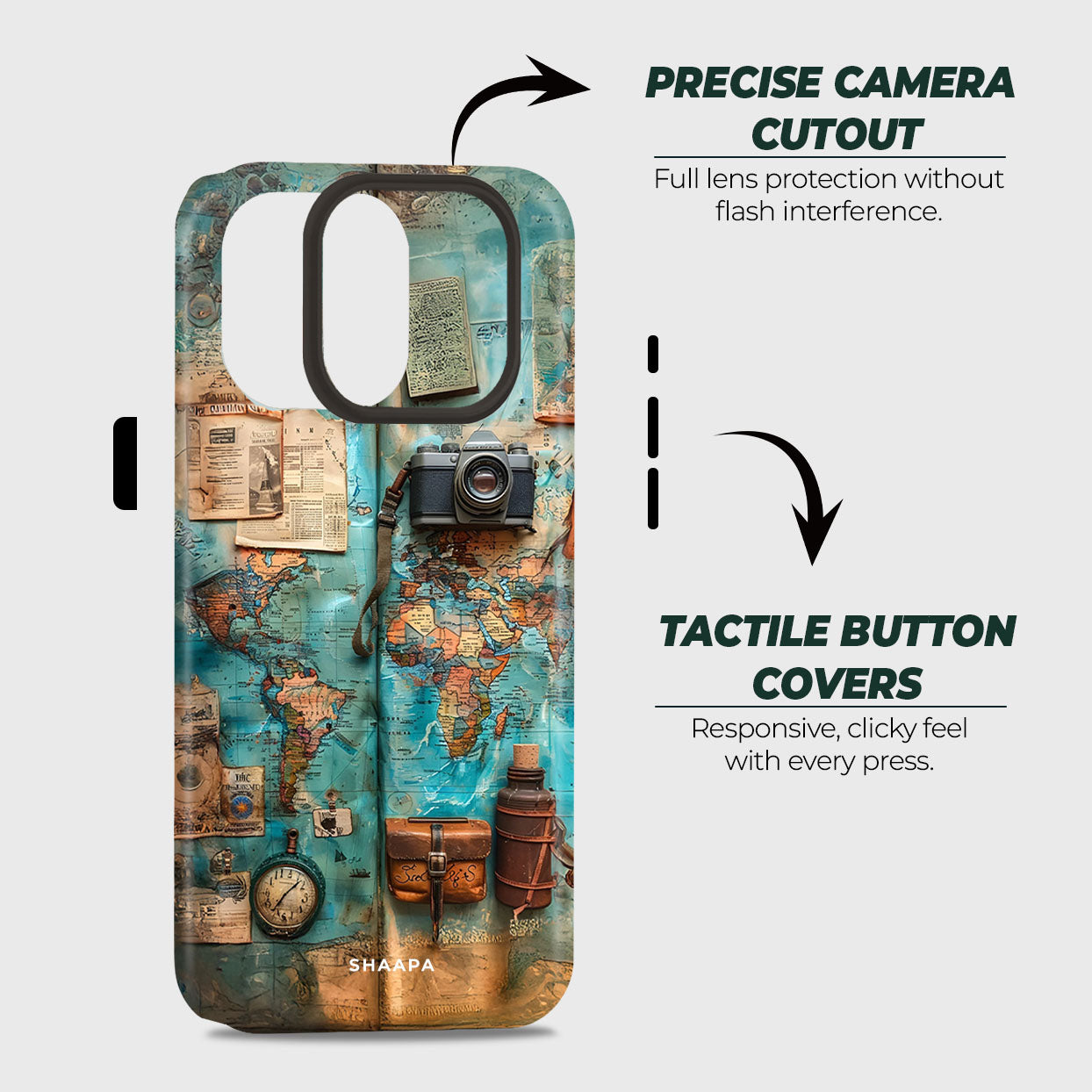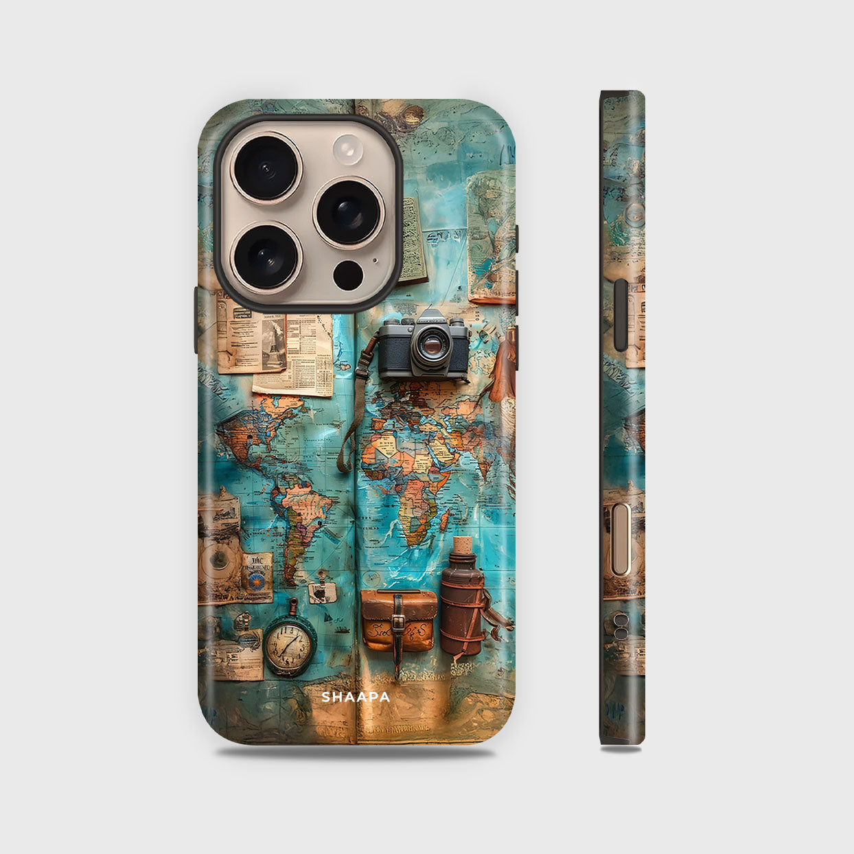 If your heart beats for travel and your soul seeks new destinations, the Wayfarer case is made just for you. Featuring a beautifully vintage-style world map filled with explorer essentials — a camera, compass, journal, and flask — this design celebrates the spirit of adventure and the thrill of discovering the unknown.