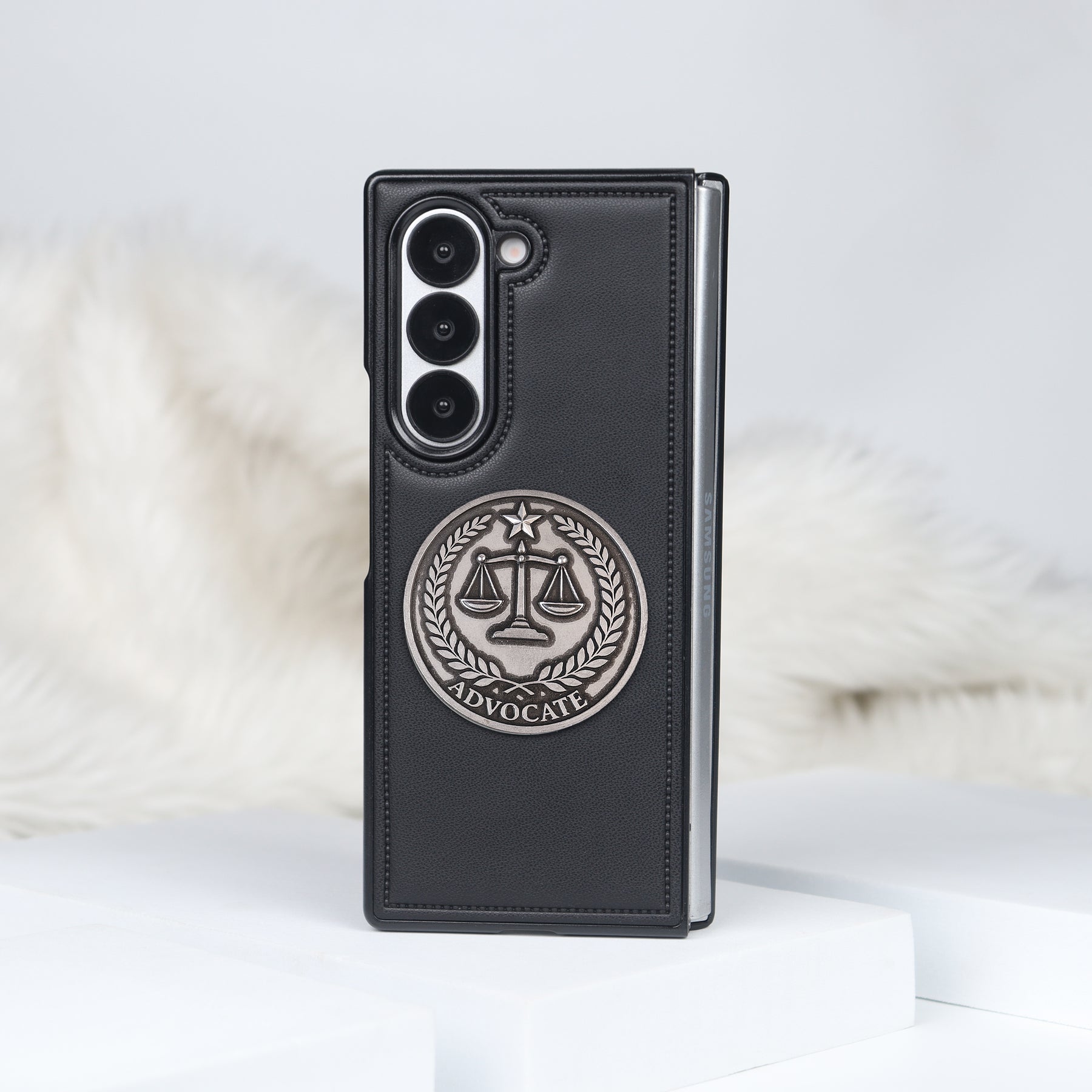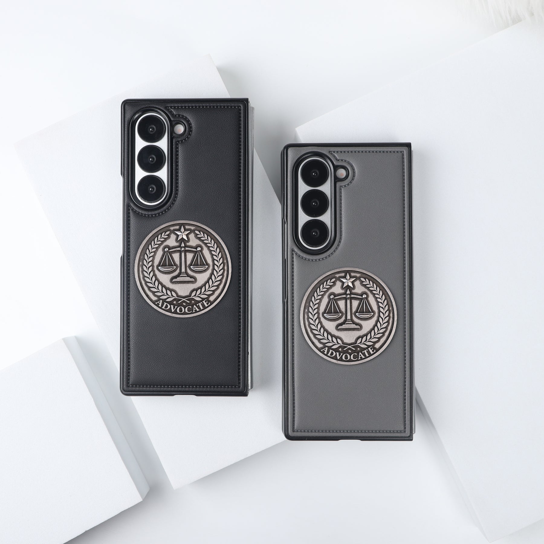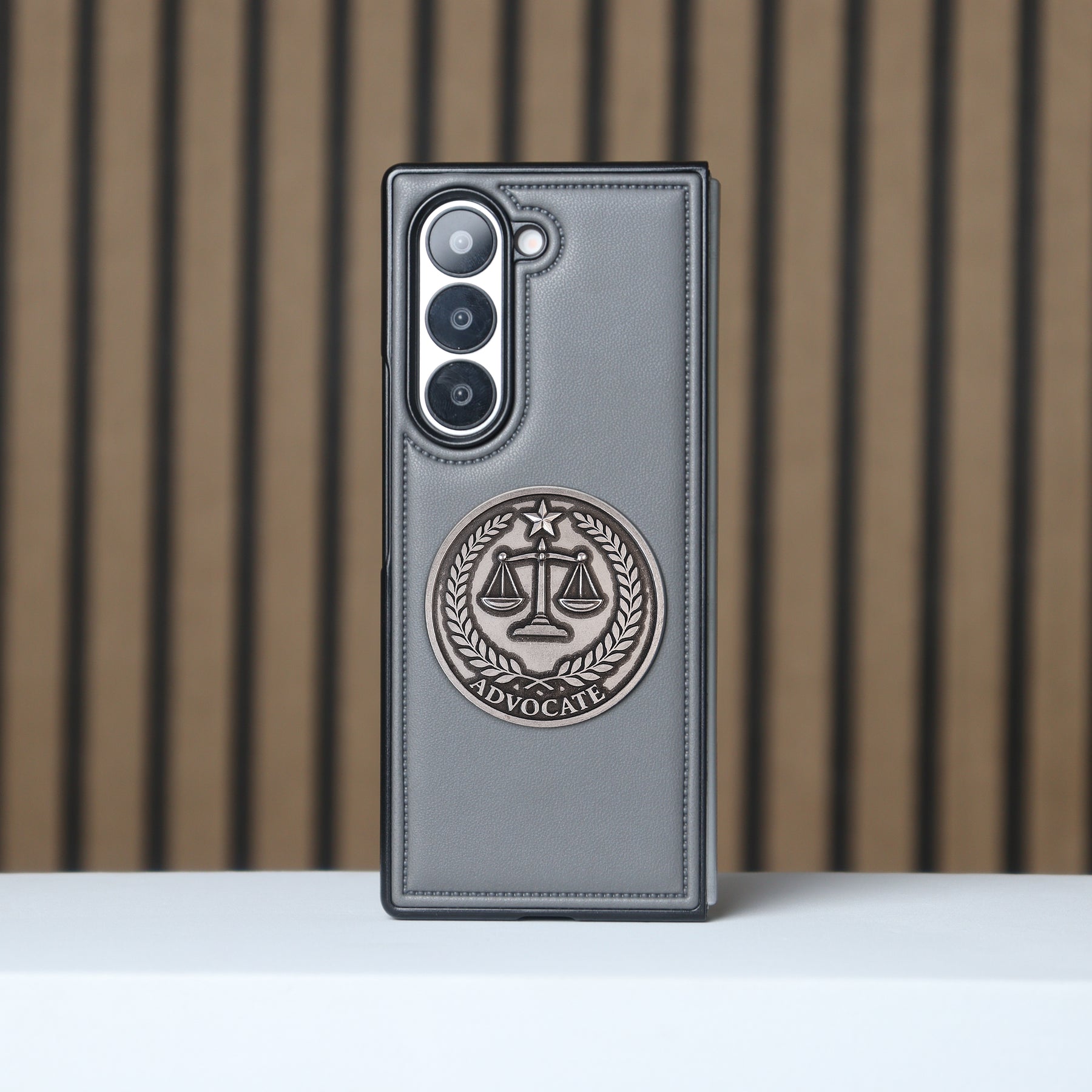 Showcase your professional identity with these Advocate Leather Case, designed specifically for foldable smartphones. Available in classic black and elegant grey, these cases are perfect for advocates, lawyers, and law students who want to combine sophisticated style with reliable protection. Made from high-quality leather finish with fine stitching, each case exudes elegance and durability. At the center, a striking metallic emblem of the Scales of Justice, encircled with laurel leaves and topped with a star, proudly displays the word “ADVOCATE”. This timeless insignia makes the case not only protective but also a powerful symbol of justice and integrity.