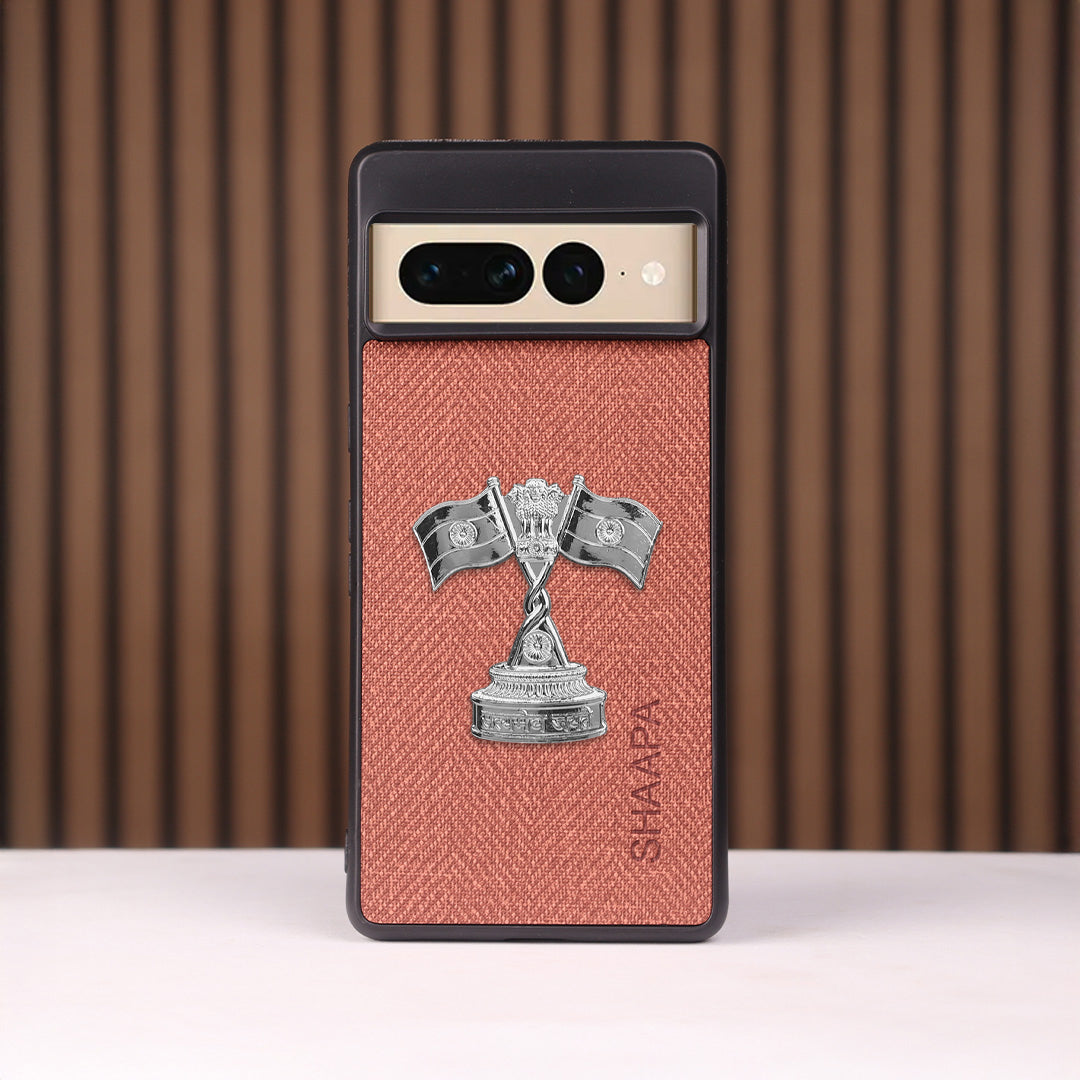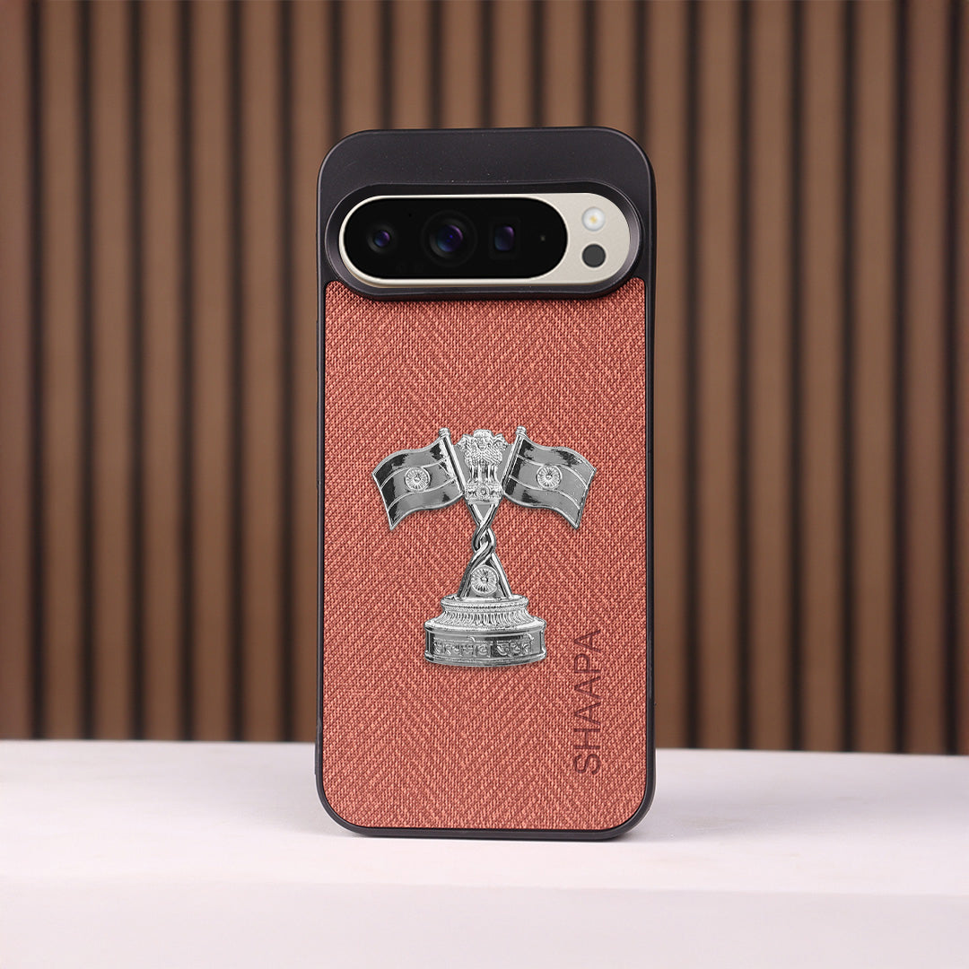 Give your phone the perfect balance of style, identity, and protection with this Nyay Stambh EmberShield Case - Google. Crafted with a refined reddish-brown leather-like finish, it is enhanced by a striking metallic Nyay Stambh featuring the scales of justice and laurel wreath – a true mark of authority, integrity, and professionalism.
